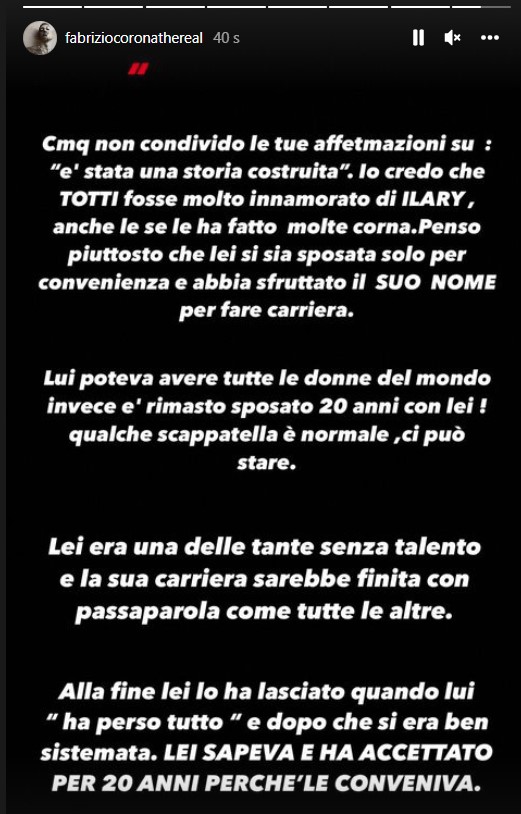 “Sì ho letto, vi ringrazio ma di questa cosa non mi interessa proprio parlare” ha risposto Iovino. Insomma non ha nè confermato né smentito la notizia del presunto tradimenti di Ilary con lui. Intanto Fabrizio Corona continua a parlare die tradimenti di Ilary e Totti e dopo aver mostrato la foto di una certa Martina, si è concentrato sulla sua nemica: l’ex letterina. Andando a ritroso nel tempo la showgirl diventa bersaglio anche del passato. secondo il suo primo fidanzato, Sean, lei lo avrebbe lasciato per fidanzarsi con Francesco Totti con lo scopo di diventare famosa e frequentare un calciatore ricco e noto. Alla fine lui l’avrebbe sempre amata, anche se tradita mentre lei no e avrebbe approfittato del momento di crisi del marito per lasciarlo. Ovviamente dopo esser diventata anche lei ricca e famosa.