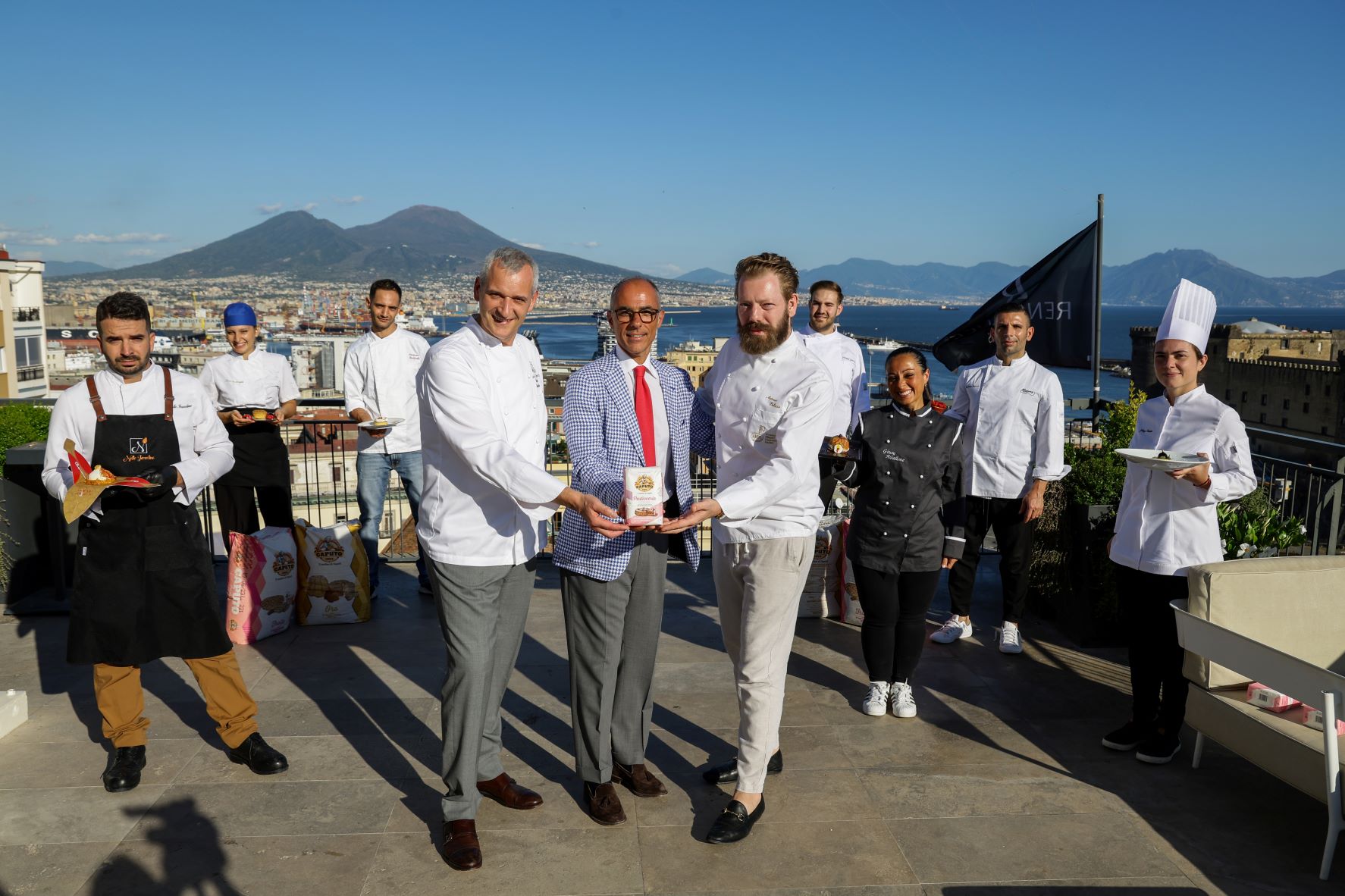 La sfida, che si è svolta sul panoramico Roof Garden Angiò del Renaissance Naples Hotel Mediterraneo, ha visto confrontarsi Giusy Avallone, della pasticceria Avallone di Quarto; Guglielmo Cavezza, titolare della Pasticceria Mommy Cafè di Cicciano; Raffaele Cristiano, della Pasticceria artigianale Raffaele Cristiano di Barra; Giovanni Giordano, pasticcere presso Sal De Riso Costa D’Amalfi di Minori; Nello Iervolino, pastry chef del Regina Isabella di Ischia e Ilaria Inchingolo, dell’Openlight caffè di Andria.