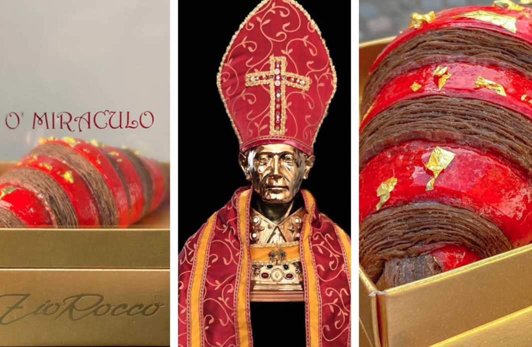 ‘O Miraculo‘ è un cornetto – in edizione limitata – extra lusso con foglie d’oro. A crearlo è stato il pasticciere Rocco Cannavino nel suo laboratorio all’Arenaccia in vico Polveriere. Gli ingredienti? Li spiega lo stesso Zio Rocco Lab Store sulla sua pagina Facebook: “Sfoglia ischitana al cioccolato fondente criollo 80% unita ad un impasto brioche al succo di lamponi selvatici, cuore di crema al latte di bufala e vaniglia del Madagascar, ragù corposo di lamponi selvatici al pepe rosa e 5 gr di composta di pellecchiella del Vesuvio. In superficie polvere di pura liquirizia calabra e a completare in superfice foglioline e scaglie d’oro puro 24kt”.