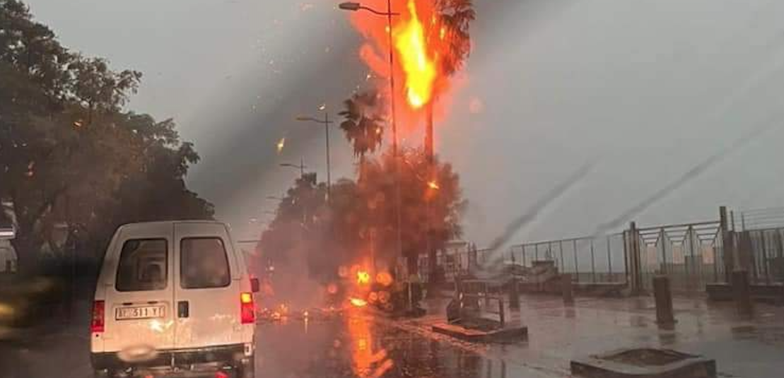 Temporale a Salerno, fulmine cade in strada e incendia un albero: paura sul lungomare