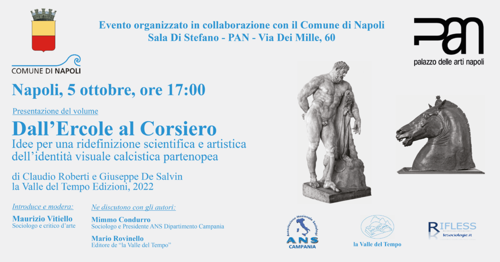 La Valle del Tempo edizioni presenterà il volume Dall’Ercole al Corsiero. Idee per una ridefinizione scientifica e artistica dell’identità visuale calcistica partenopea di Claudio Roberti e Giuseppe De Salvin (2022) mercoledì 5 ottobre, ore 17.00 presso la Sala Di Stefano del Palazzo delle Arti di Napoli (via dei Mille 60, Napoli). Introduce e modera Maurizio Vitiello. Ne discutono con gli Autori Domenico Condurro e Mario Rovinello. L’evento è organizzato in collaborazione con il Comune di Napoli.