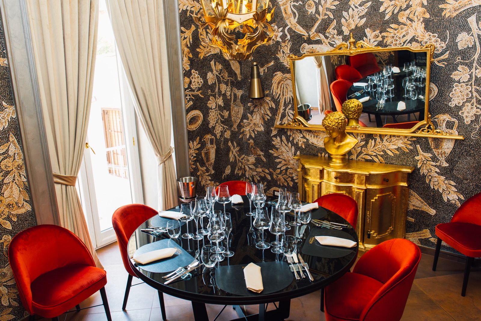 Una sala curata nei minimi dettagli, con un tavolo da otto posti con una porta a vetro sulla cucina, arricchita da un parato pompeiano. L’obiettivo è regalare confort e riservatezza agli ospiti, far sì che possano dialogare direttamente con lo chef, rubandogli magari anche qualche consiglio ai fornelli.