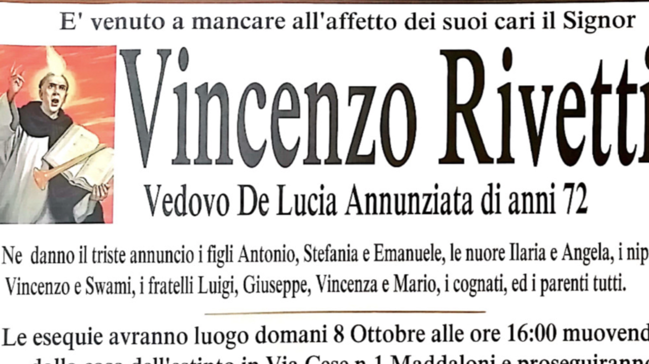 La figlia di Vincenzo aveva lanciato l’allarme non vedendolo tornare a casa, poi si è recata sul posto – in località Carmiani – il 72enne era a terra esanime. Le esequie si terranno domani sabato 8 ottobre.
