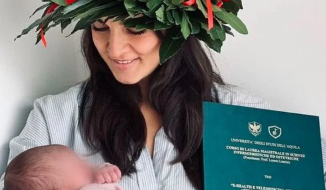 Poche ore dopo Martina era laureata e mamma. E’ nata la piccola Nunzia, protagonista subito dopo la nascita proprio per il modo incredibile in cui è venuta al mondo. Virale lo scatto di Martina con in braccio la figlia e nell’altro la tesi mentre in testa ha l’alloro. A raccontare la storia è l‘Università degli Studi dell’Aquila che si è congratulata pubblicamente con la mamma e laureata.