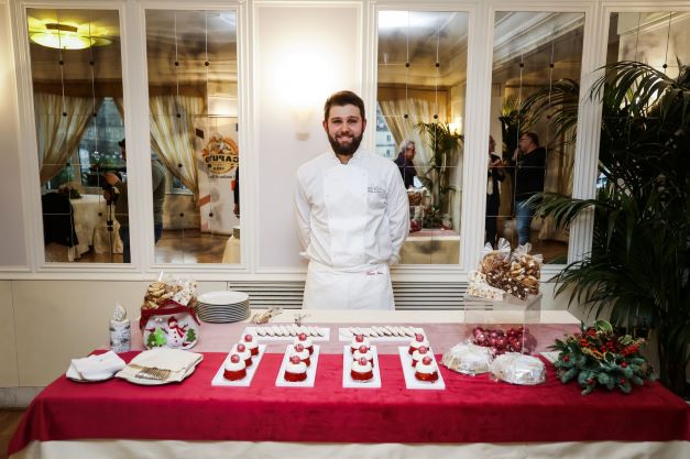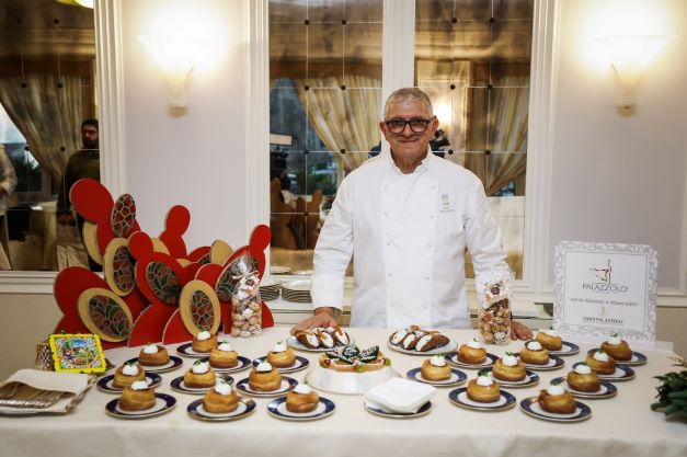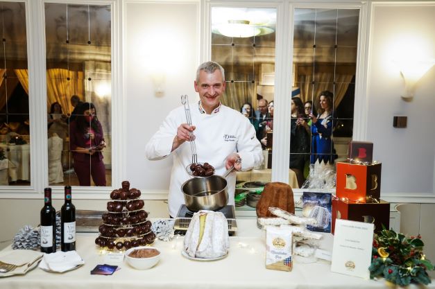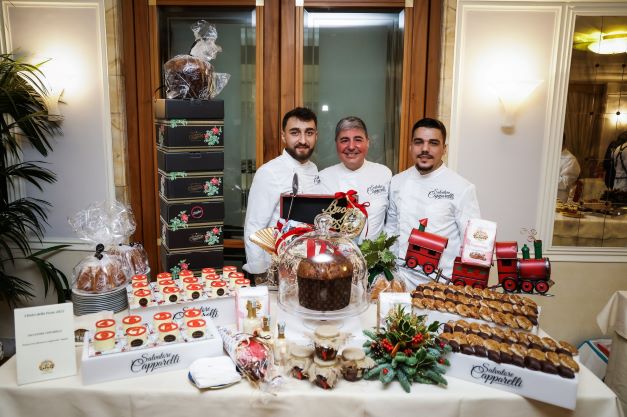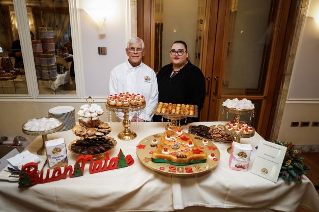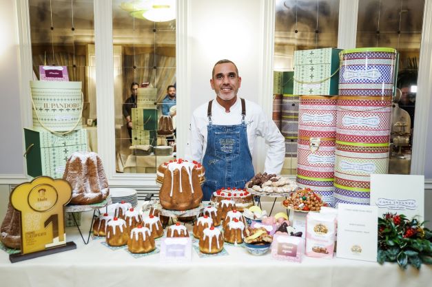 Sal De Riso, Maestro Pasticcere della Sal De Riso Costa d’Amalfi nonché presidente dell’AMPI – Accademia Maestri Pasticceri Italiani, ha portato in degustazione dei bocconcini di babà ai frutti di bosco, inzuppati in una bagna alla vaniglia, rivestiti di glassa al lampone. Tra i suoi lievitati natalizi, il Panettone Passione napoletana, farcito con bucce d’arancia candita, uvetta sultanina australiana, albicocche del Vesuvio, cedro di Diamante e fichi bianchi secchi del Cilento D.O.P. e il Panettone Oro Puro, farcito con cioccolato fondente Sur Del Lago 72% Venezuela e ricoperto di foglia d’oro.