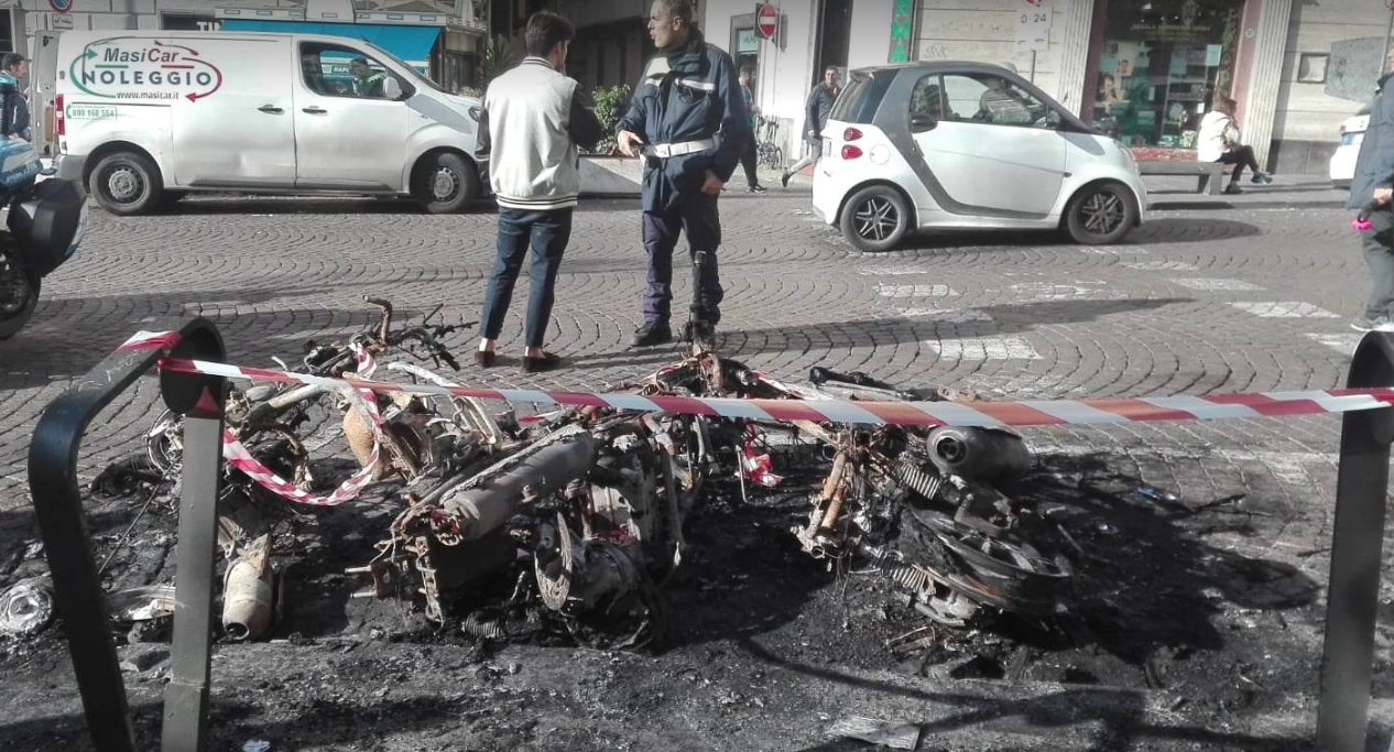 Due carcasse di scooter sono state trovate in piazza dei Martiri all’esterno del locale ‘Rossopomodoro Galleria Navarra’, vicino lo store Feltrinelli. È da ieri che le immagini dei due motocicli distrutti dalle fiamme hanno invaso il web attraverso i social.