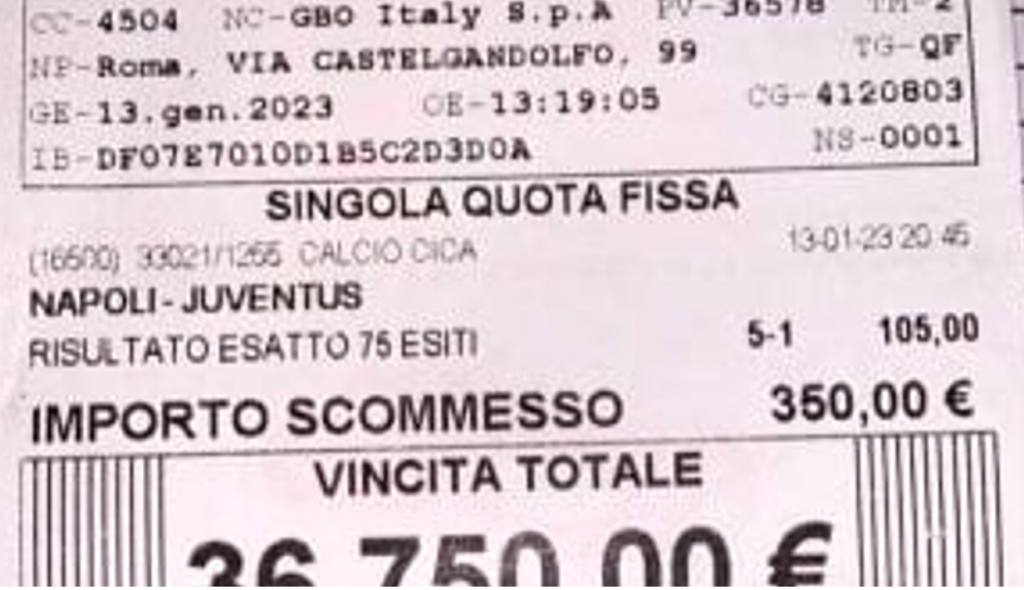 Schedina al limite della follia che però si è rivelata vincente: il coraggioso scommettitore ha puntato ben 350 euro sulla vittoria per 5-1 del Napoli e ha portato a casa una cifra record, 36.750 euro.