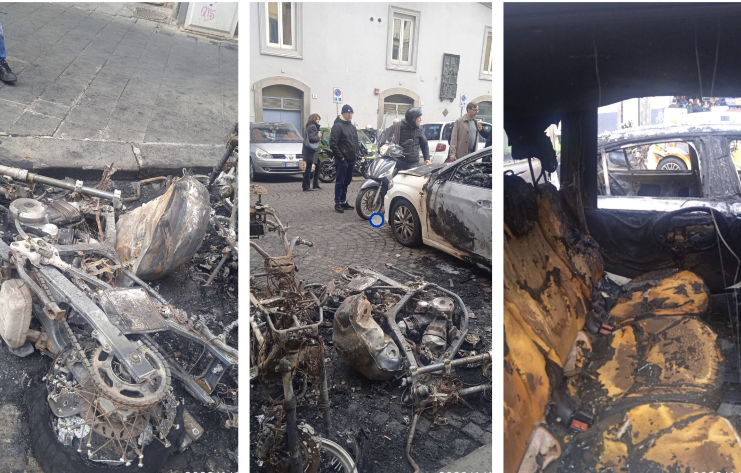 Stando alle ricostruzioni dei presenti ad essere incendiato per primo sarebbe stato uno dei ciclomotori in sosta che, fondendosi la carcassa metallica è poi caduto sul fianco sinistro appoggiandosi all’auto vicina e dà lì ad effetto domino avrebbe coinvolto le altre vetture presenti carbonizzandole totalmente.