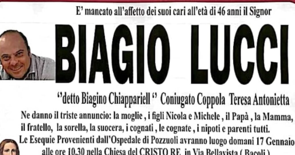 Drammatico lutto a Bacoli, in provincia di Napoli, per l’improvvisa scomparsa di Biagio Lucci, detto “Biagino Chiappariell”. L’uomo, 46 anni, è scomparso a causa di un arresto cardiaco.