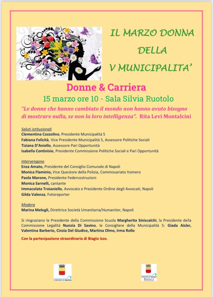 Continua il ciclo di incontri organizzato dalla V Municipalità di Napoli Arenella-Vomero nell’ambito del “Marzo Donna”. Il prossimo dibattito “Donne & Carriera” si terrà il 15 marzo alle ore 10 presso la sala consiliare Silvia Ruotolo.
