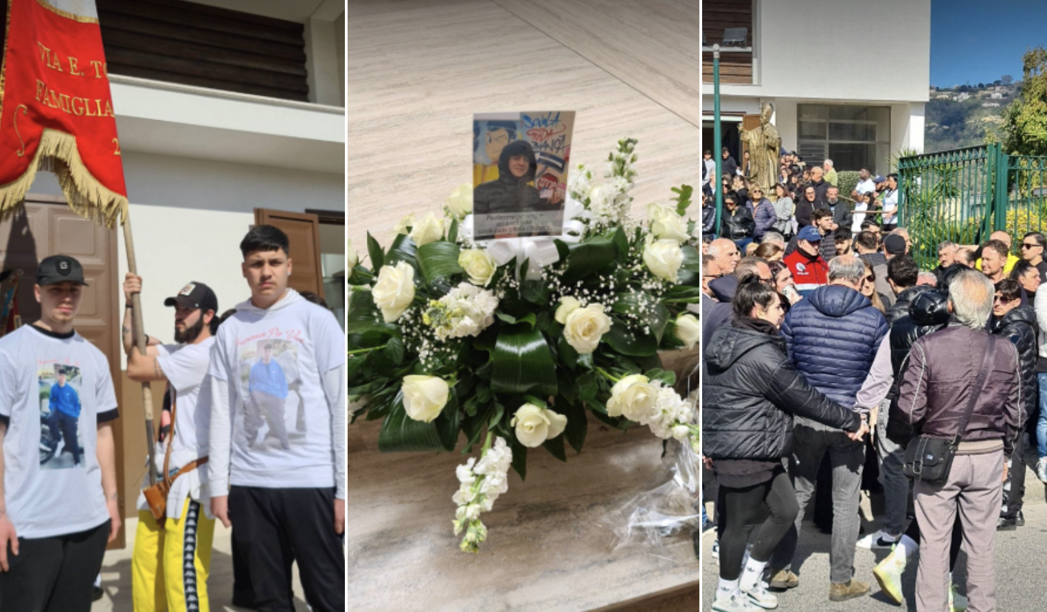 Tantissimi i giovani e alcuni, tra gli amici più stretti di Francesco Pio, indossano una maglietta con una sua fotografia e la scritta ‘Francesco Pio vive‘. All’esterno della chiesa sulla cancellata è stato affisso uno striscione con l’immagine del giovane e la scritta “Dentro ogni nostro pensiero c’è sempre un po’ di te“.