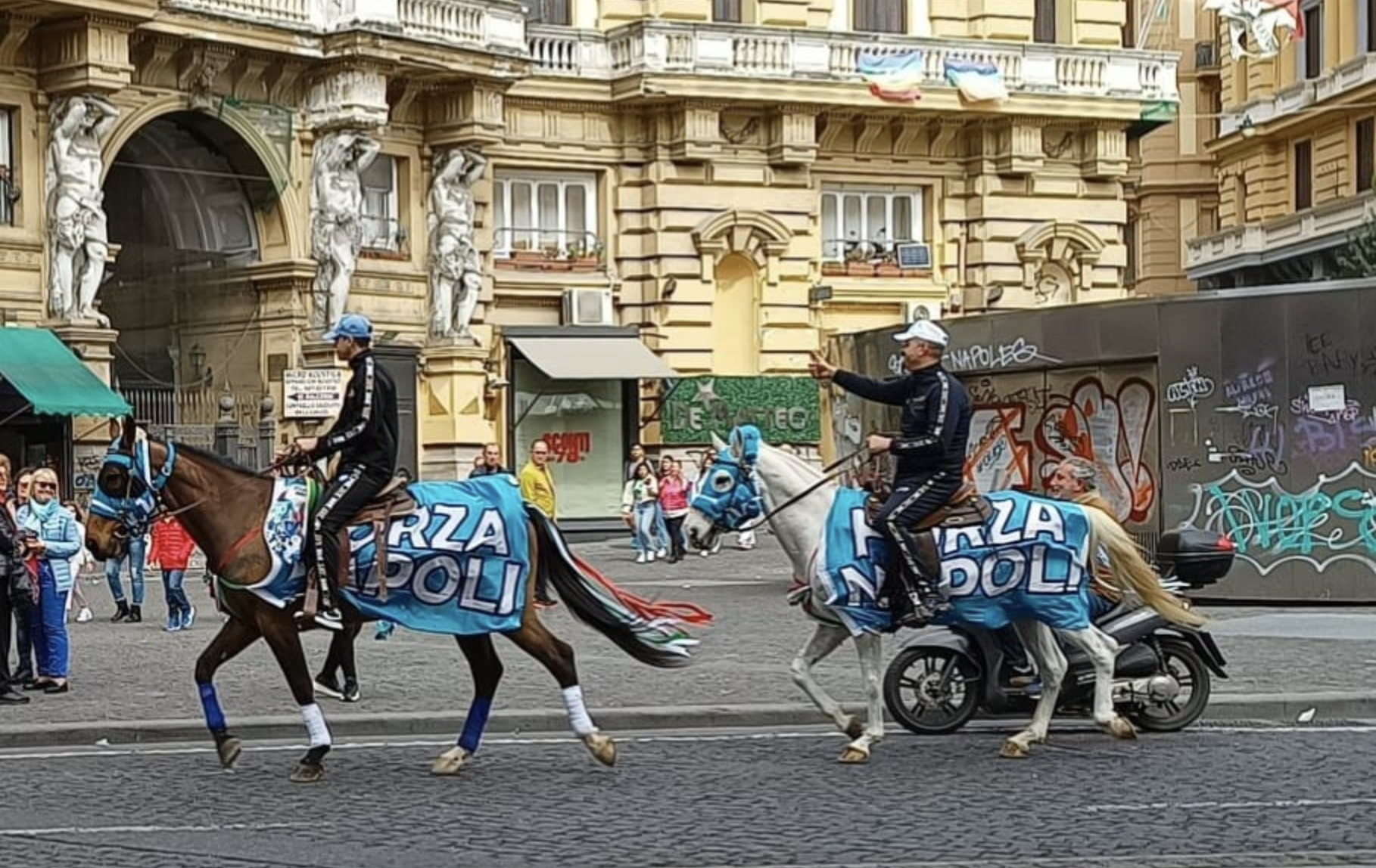Insomma, per la festa scudetto, a Napoli è stato visto anche il cavallo – Osimhen. Dopo le torte, le mimose, le uova di Pasqua, nel centro di Napoli, tra piazza Garibaldi e il corso Umberto, ha sfilato anche l’animale con i classici colori partenopei.