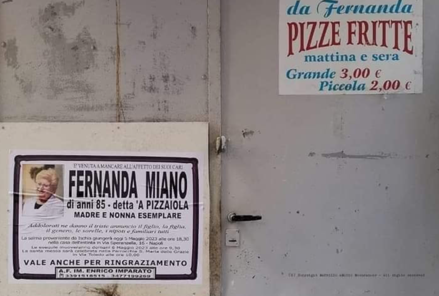 Fernanda Miano, conosciuta come “”A Pizzaiola”, ha lasciato questo mondo all’età di 85 anni. Non si conoscono i motivi del decesso, probabilmente per cause naturali vista l’età. La donna era molto apprezzata e conosciuta e sul cartello funebre vi è scritto che è stata “una mamma e una nonna esemplare”.