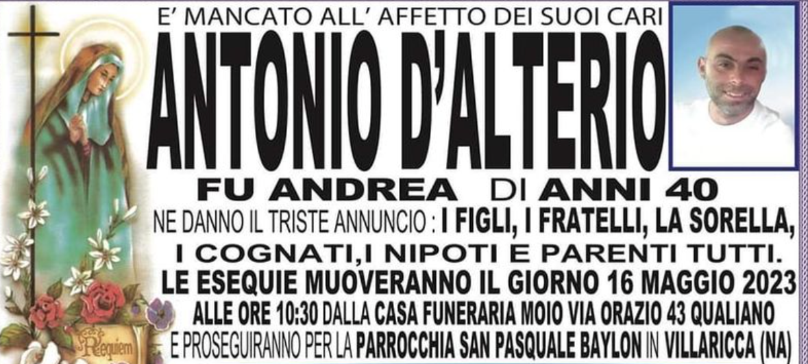 Lutto per due comunità. Dolore a Qualiano e Villaricca, località in provincia di Napoli. È infatti scomparso Antonio D’Alterio, giovane marito e padre 40enne. I funerali si terranno domani, 16 maggio, alle ore 11 presso la Chiesa di San Pasquale Baylon a Villaricca.