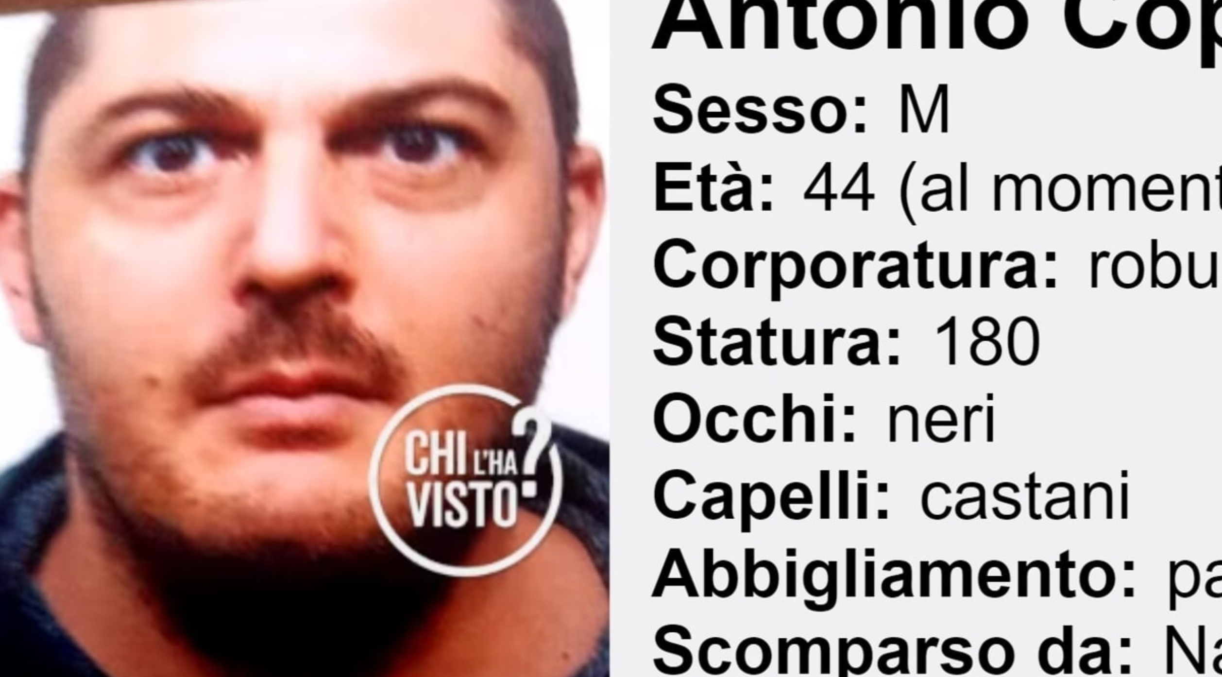 Si chiama Antonio Coppola, ha 44 anni e vive a Napoli con la famiglia. Lo scorso giovedì, 15 giugno si è allontanato da casa e da allora non si sono più avute sue notizie. Con sé ha la tessera sanitaria e una fotocopia del documento di identità.