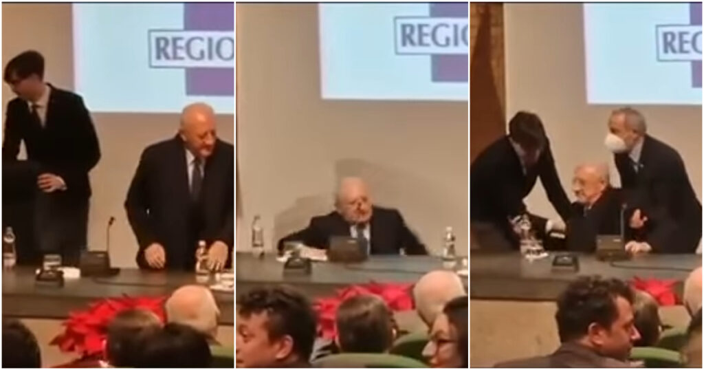 Cade per terra davanti a tutti il governatore Vincenzo De Luca, durante il tradizionale brindisi di fine anno della Regione Campana a Palazzo Lucia. Si alza un momento dalla sedia, qualcuno la toglie, e si trova rovinosamente a terra, e non si tratta di uno scherzo.