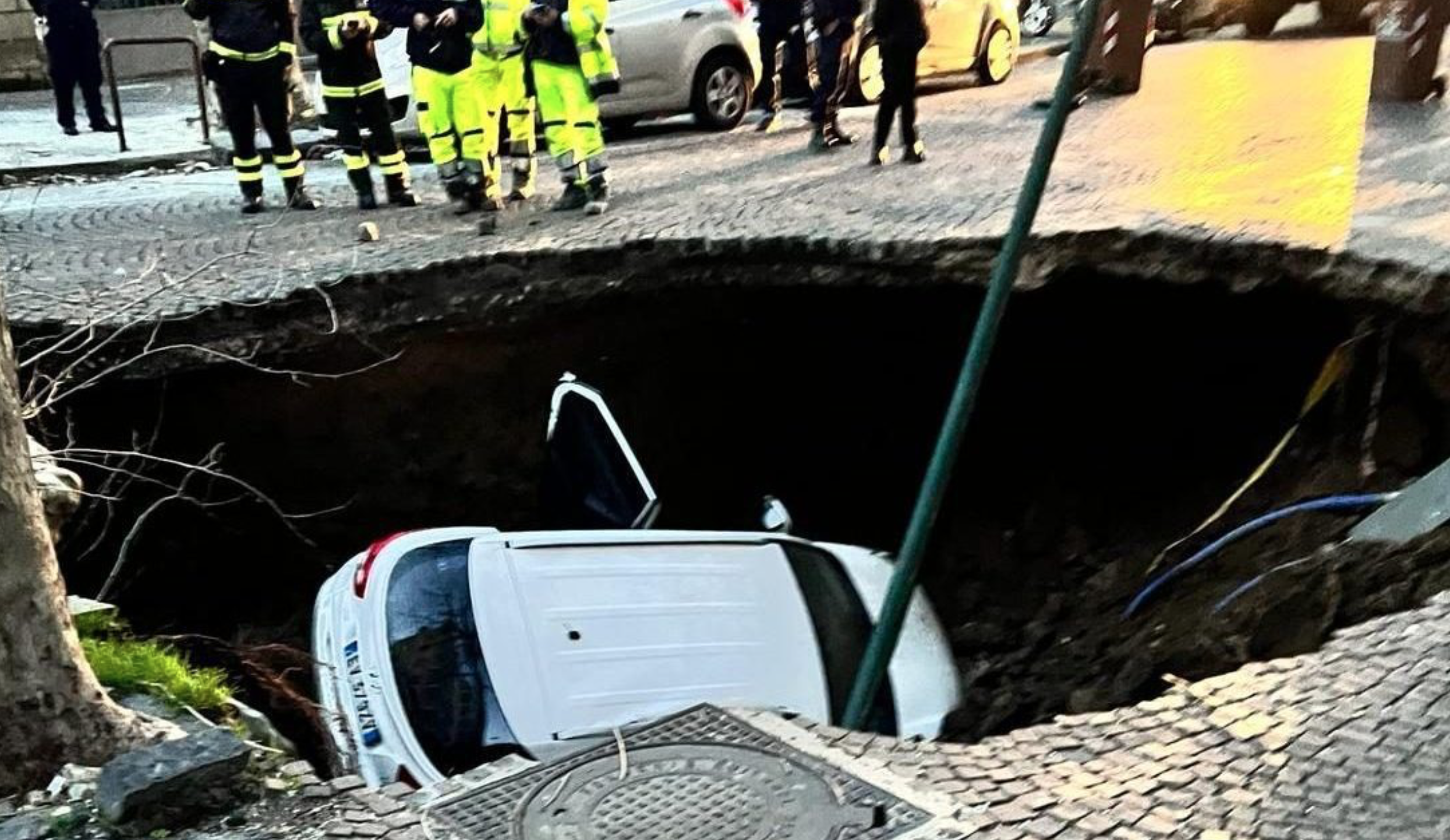 Si è aperta una vera e propria voragine in via Morghen e due auto sono state inghiottite mentre transitavano. I due ragazzi all’interno sono riuscita a uscite grazie all’aiuto di due militari in servizio, ma sono vivi per miracolo.
