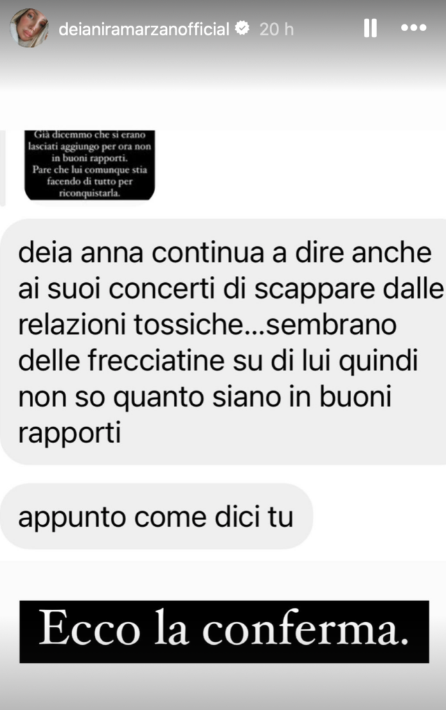 La cantante di Sora pare abbia più volte parlato in interviste e concerti di una relazione tossica, chiedendo anche ai suoi fan di fare attenzione e di uscire sempre da queste relazioni. I due non si seguono più sui social e a quanto pare la relazione sarebbe finita malissimo.
