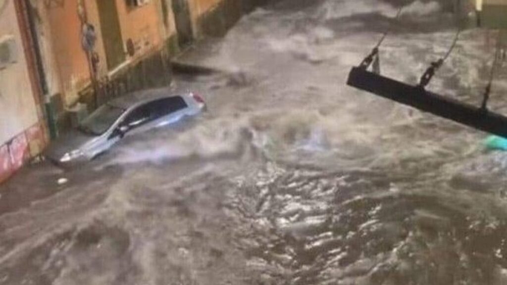 A Torre del Greco, nella provincia di Napoli, le abbondanti piogge hanno trasformato le strade in un fiume e l’acqua ha trascinato con sé tutto comprese le automobili.