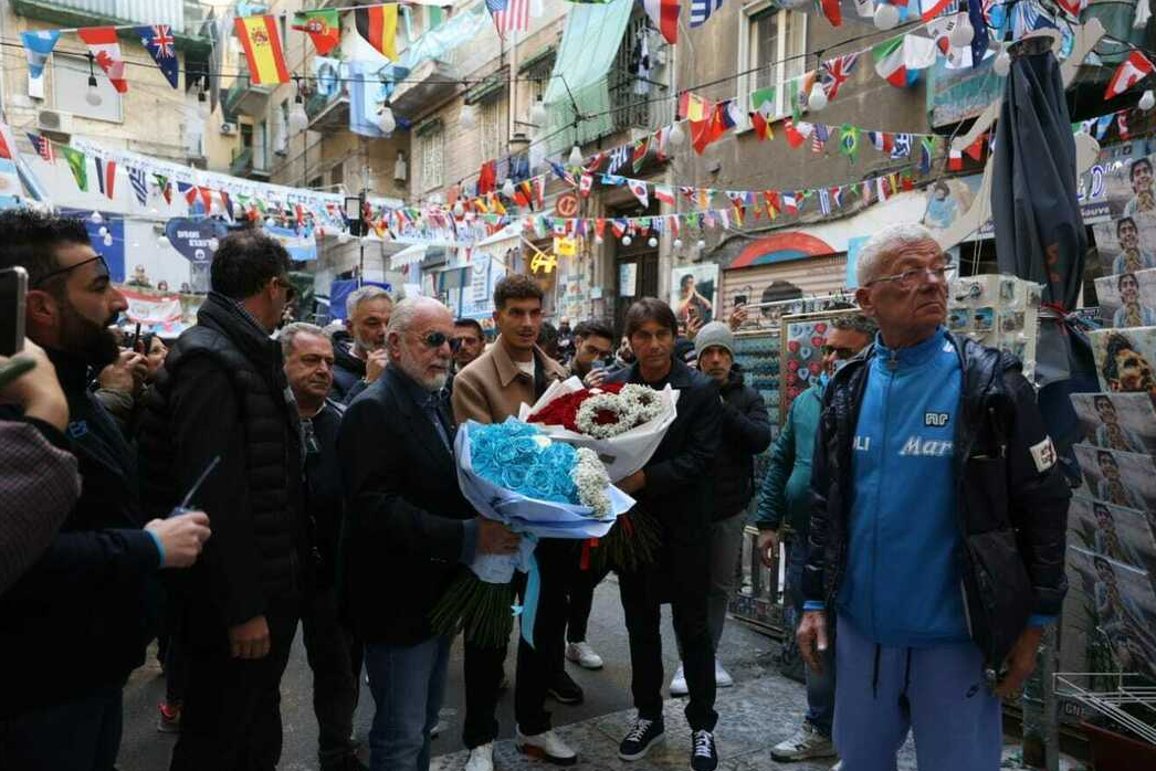 Il Napoli, rappresentato da presidente, allenatore e capitano, ha omaggiato il Pibe de Oro presso il murale ai Quartieri Spagnoli, meta di pellegrinaggio di tifosi, turisti e curiosi. Antonio Conte, Aurelio De Laurentiis e Giovanni Di Lorenzo, in rappresentanza di tutta la squadra, hanno così ricordato Diego.