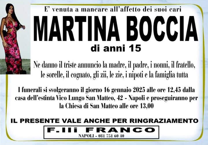 “Non Ci Posso Credere, Sembrava Ieri Che Festeggiavamo Oggi Non Ci Sei Più 💔Riposa in Pace Martina Che Il Signore Ti Accolga Tra Le Sue Braccia🙏💔🥲Non Ci Sono Parole…”, scrive un amico. Sulla pagina dei Quartieri Spagnoli il cordoglio per la famiglia della ragazza: “Purtroppo Martina Boccia non ce l’ha fatta, in tarda mattinata ci ha lasciato a causa di un’improvvisa malattia. La giovannissima aveva soli 15 anni, aveva ancora tutta la vita davanti. Porgiamo sentite condoglianze alla famiglia”.