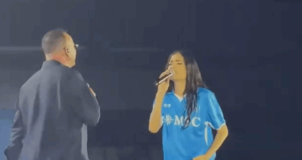 Elodie incanta il Maradona: fan in delirio con la maglia azzurra e duetto con Gigi D’Alessio