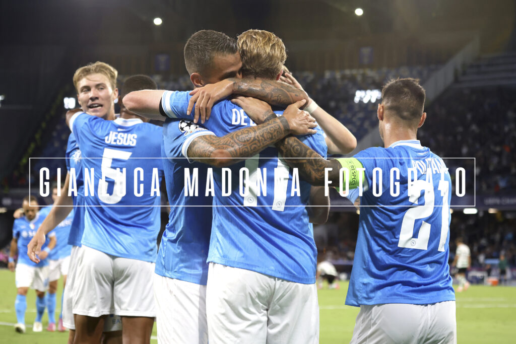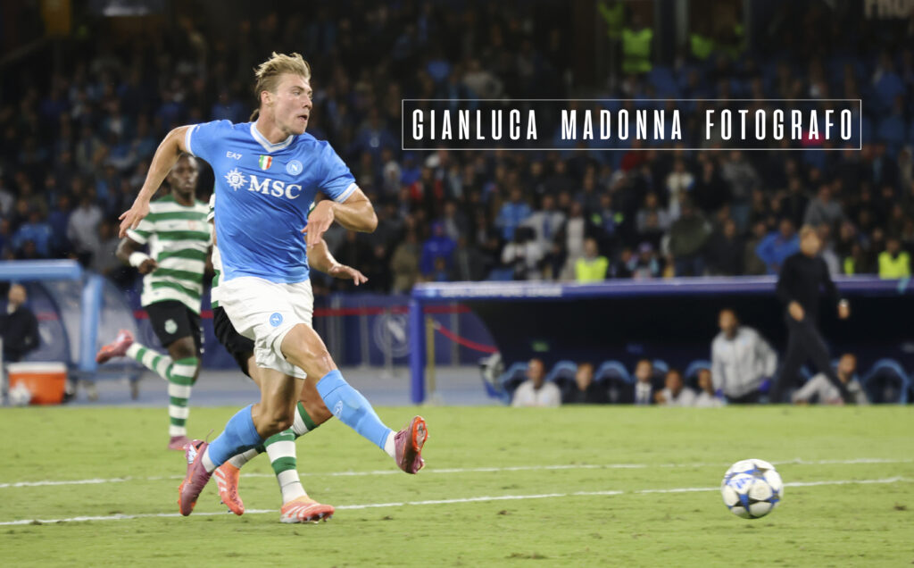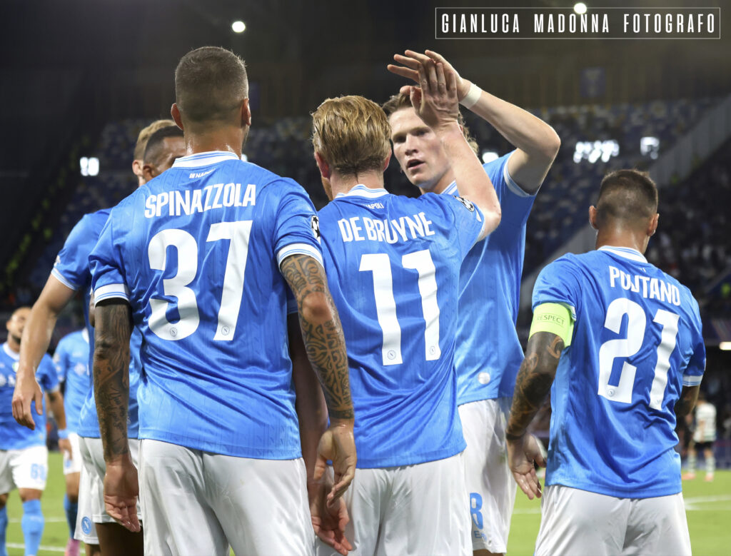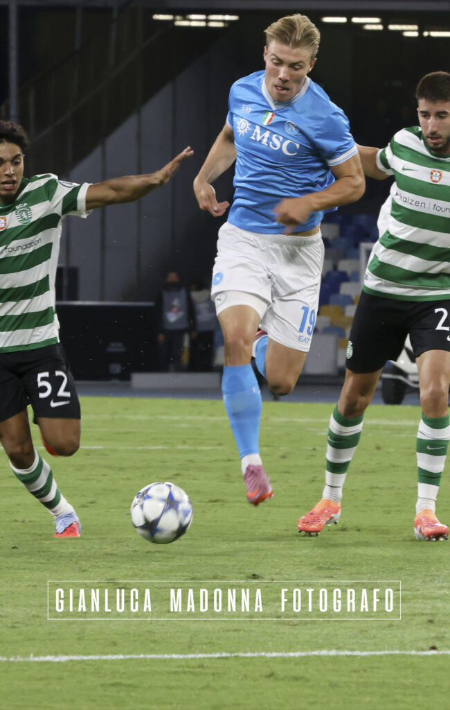 Un altra notte di stelle si aggiunge nella storia del Napoli; i campioni d’Italia vincono contro i campioni di Portogallo in Champions League, (Danny Makkelie direttore di gara olandese) nel minuto 36° brilla Kevin De Bruyne con un assist a favore di Hojlund che trasforma tutto il primo tempo in un vero e proprio spettacolo per lo stadio Maradona di Napoli che vede battuto Rui Silva il portiere portoghese. Tanto pressing ed altre occasioni a favore del Napoli ma si conclude il primo tempo 1.0 per il Napoli. Nel secondo tempo lo Sporting effettua delle sostituzioni e arrivano Suarez e Goncalves e nel minuto 62° arriva il pareggio portoghese con un rigore siglato proprio da Suarez. Conte cambia quindi modulo inserendo Neres e Lang al posto di Politano e McTominay ed è subito 4-3-3 al posto del 4-1-4-1 e al 79° si ripete la coppia De Bruyne-Hojlund con un colpo di testa che spiazza tutti e la gara finisce 2-1 per il Napoli che comunque soffre nel finale.