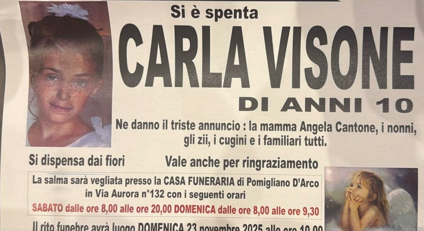 Il cordoglio è stato espresso con affetto a quanti le volevano bene, in particolare alla mamma Angela e ai nonni, che già negli anni scorsi avevano dovuto affrontare il decesso del padre di Carla. Numerosi i messaggi di vicinanza sui social per Angela, a cui amici e conoscenti si sono stretti in un abbraccio virtuale. Il rito funebre per dare l’ultimo saluto alla piccola Carla si terrà domenica 23 novembre, alle ore 10:00, presso la Chiesa San Francesco D’Assisi di Pomigliano.