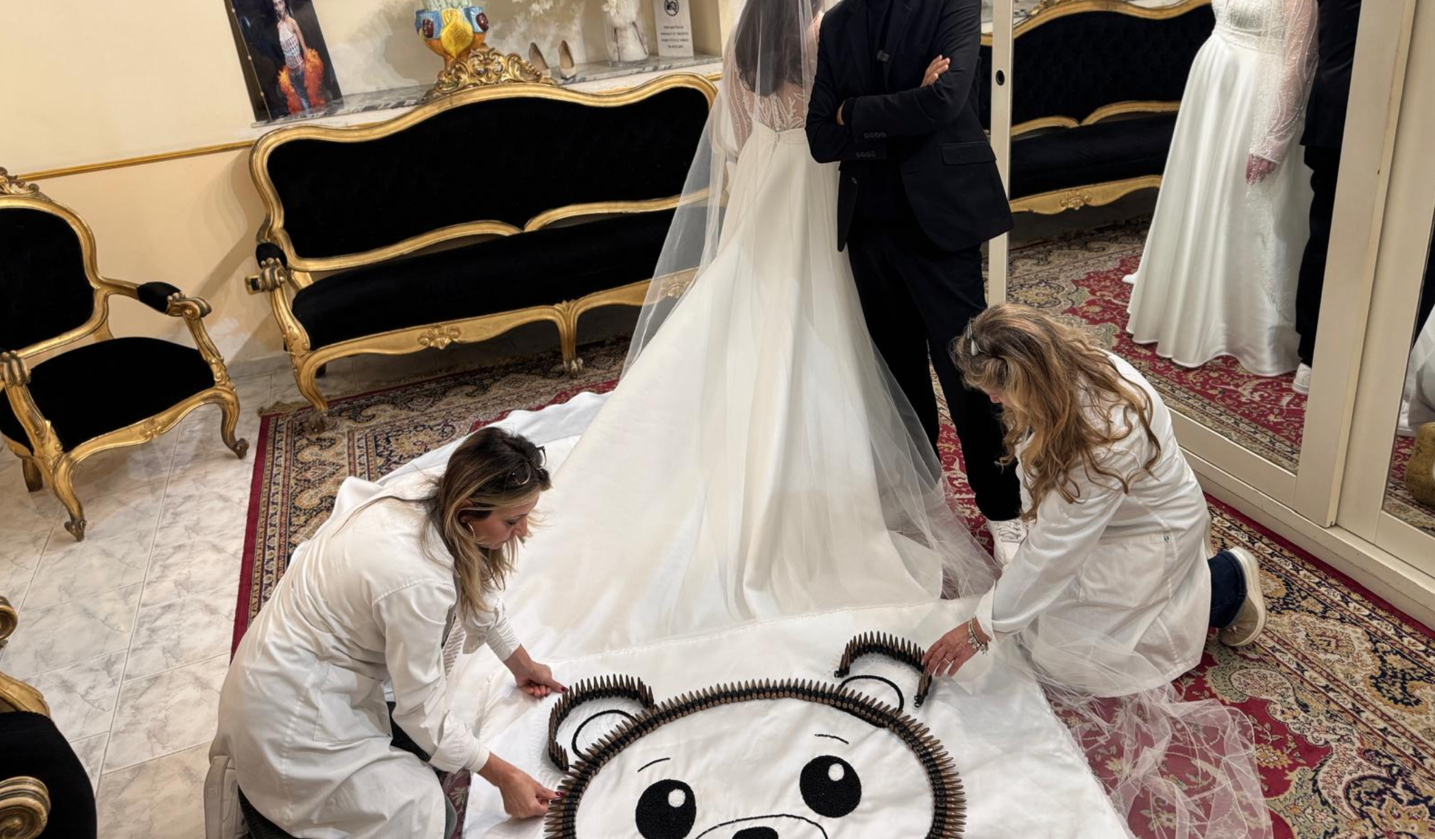 Per non dimenticare il sangue innocente versato e trasformare il dolore in un messaggio forte, Federica ha scelto un abito da sposa molto particolare. L’opera, realizzata dal maestro Gianni Molaro, è “decorata” con 1000 proiettili veri. Questi proiettili non sono usati per spaventare, ma per comporre la figura di un orsetto sulla stoffa, a simboleggiare l’innocenza perduta e, forse, la nuova vita che Federica porta in grembo. Questo gesto coraggioso è un tributo solenne alla memoria delle due vittime e un’occasione per accendere i riflettori sulla violenza subita dai loro cari.