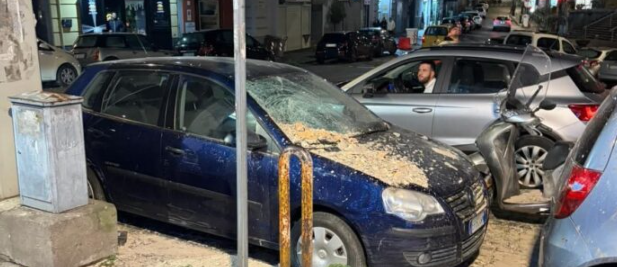 Il crollo ha investito diverse vetture in sosta, danneggiandole pesantemente, e ha colpito l’area esterna di una nota pizzeria della zona. Solo il caso ha evitato una tragedia: a causa della pioggia battente, infatti, i tavoli e le sedie del locale non erano occupati dai clienti ma si trovavano accatastati all’ingresso. Inoltre, al momento del distacco, sul marciapiede— solitamente molto frequentato da giovani e residenti — non transitava nessuno, scongiurando il ferimento di passanti.
