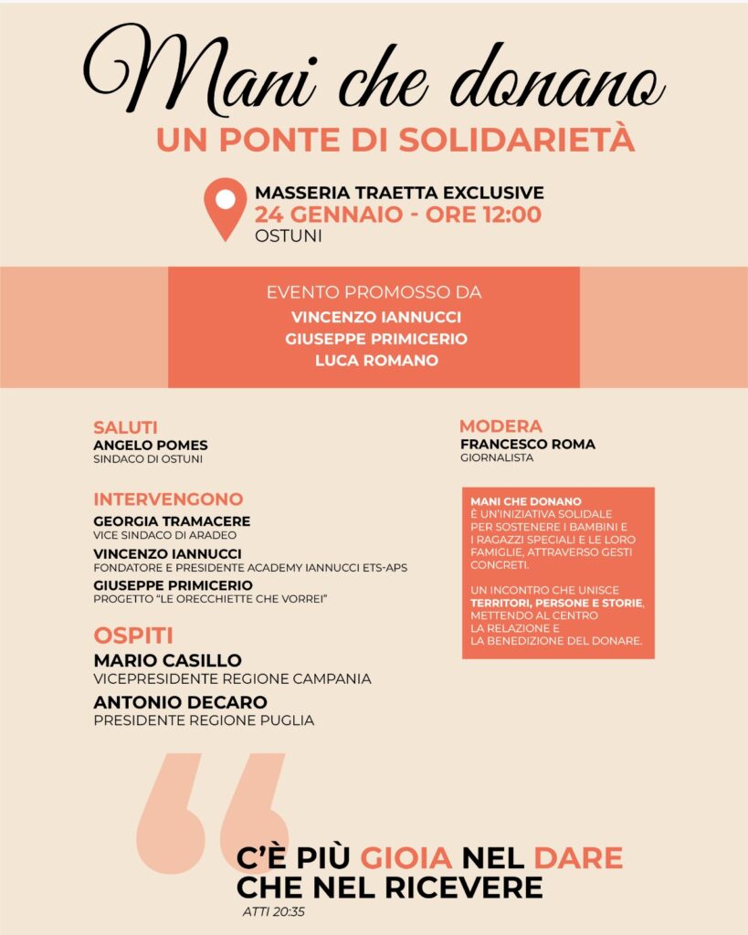 L’iniziativa di Ostuni nasce come un progetto di solidarietà concreta volto a sostenere bambini e ragazzi speciali e le loro famiglie, attraverso azioni reali e significative. Non si tratta solo di una donazione, ma di un incontro capace di unire territori, persone e storie diverse, creando uno spazio di condivisione e ascolto. Al centro dell’evento vi è la relazione umana, intesa come valore fondamentale, e il profondo significato della benedizione del donare, un gesto che arricchisce chi riceve ma anche chi sceglie di mettersi al servizio degli altri.