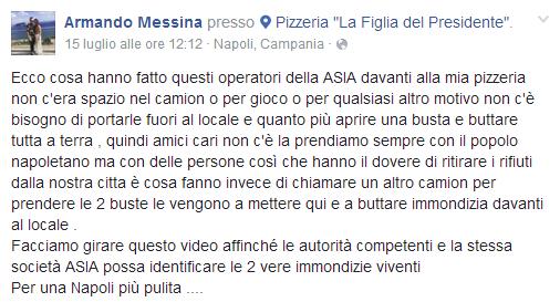 Armando Messina, titolare della Pizzeria "La figlia del Presidente" di via Grande Archivio, ha denunciato con un video e un post su Facebook alcuni dipendenti dell'Asia, l'azienda che si occupa della raccolta dei rifiuti a Napoli. Nelle immagini delle telecamere di sicurezza del locale di Messina si vede un camioncino, ...
