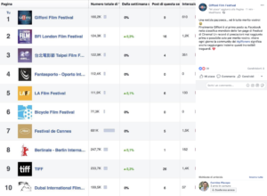 Il Giffoni Film Festival esulta perché ritiene che la propria pagina Facebook abbia raggiunto il “primo posto su Facebook nella classifica mondiale delle fan page di Festival di Cinema” come postato dal suo direttore Claudio Gubitosi, ma in realtà non è così. E basterebbe leggere i dati per rendersi conto di tutto. La classifica postata da […]
