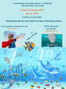 Venerdì 24 gennaio 2020, alle ore 15.00, avrà luogo l’inaugurazione della nuova sala d’attesa del Reparto di Diabetologia Pediatrica dell’Azienda Ospedaliera Universitaria “Luigi Vanvitelli” di Napoli. Le pareti bianche hanno fatto posto al mare popolato da pesci sorridenti e alghe amiche che tentano di rendere meno difficile la permanenza del bambino in ospedale. Ma non […]