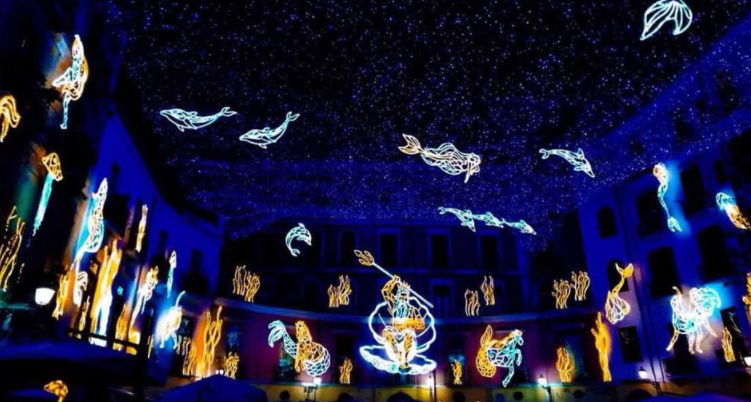 Quest’anno il centro storico sarà illuminato da una suggestiva volta celeste, sul Corso Vittorio Emanuele ci sarà una cascata di lampadari e globi illuminati e a piazza Flavio Gioia verrà installato il regno del mare, con Nettuno e il suo tridente fiammante che darà il benvenuto.