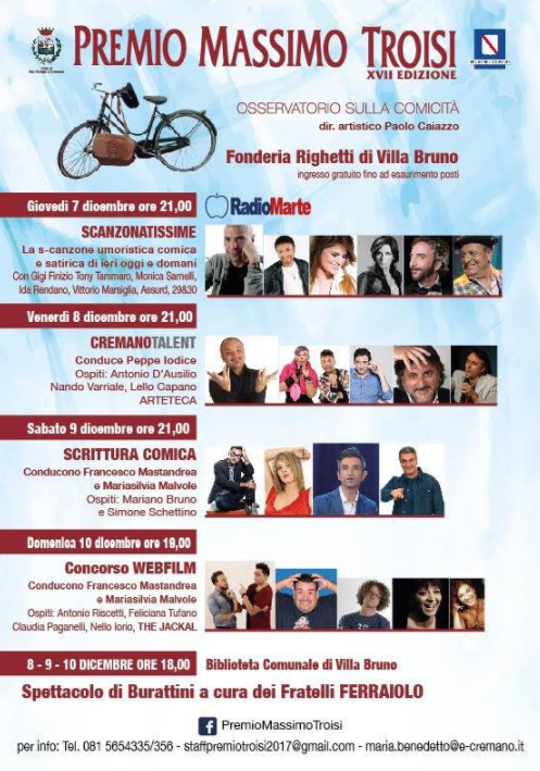 All’interno della Fonderia di Villa Brumo, dal 7 al 10 dicembre 2017 si svolgerà la fase finale del Premio Massimo Troisi. Tantissimi gli eventi gratuiti con grandi ospiti d’eccezione, fra tutti il gruppo comico più famoso del web The Jackal.
